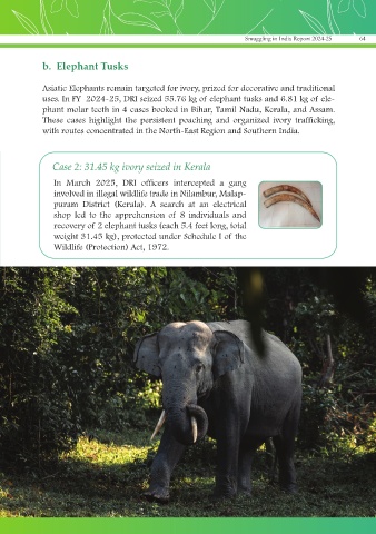 uses. In FY 2024-25, DRI seized 55.76 kg of elephant tusks and 6.81 kg of ele-